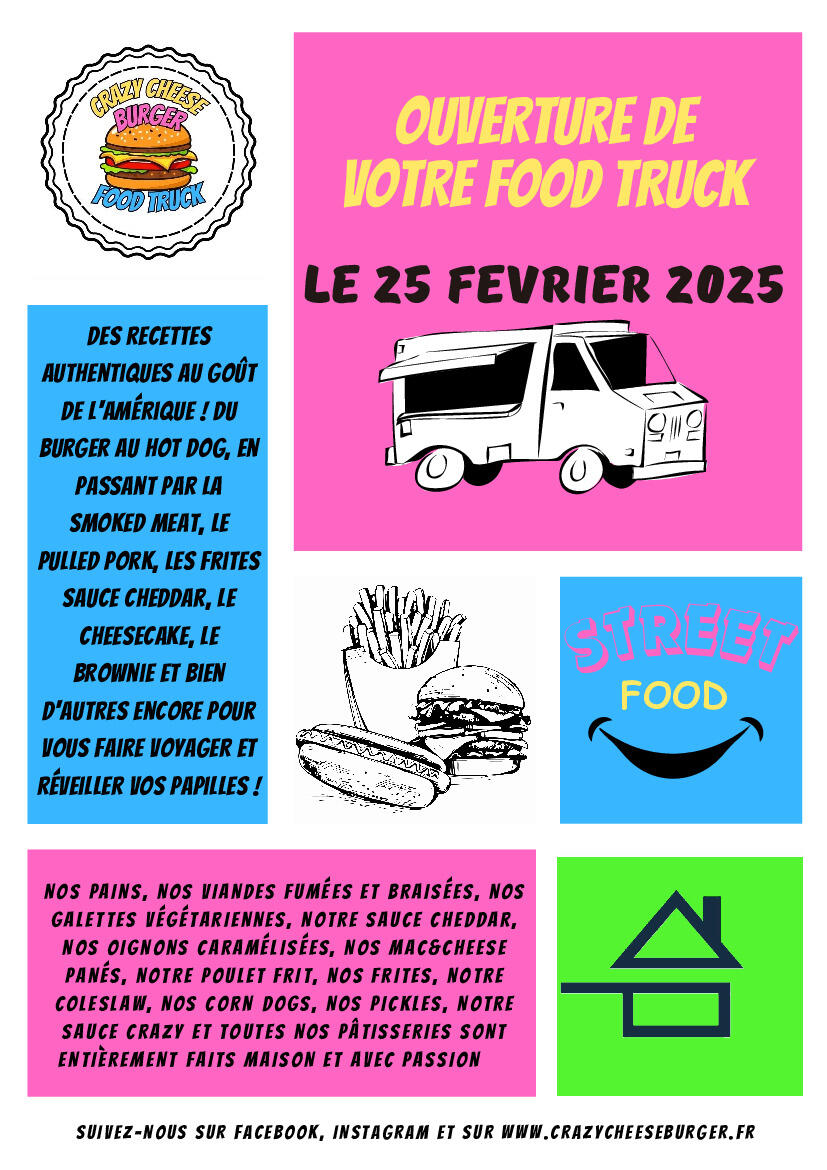 Nouveau Food Truck Crazy Cheese Burger le 25 février 2025 2/18/25 Le Food Truck Crazy Cheese Burger sera présent sur la place de la Mairie à Saint Martin de Boscherville tous les : Mardis de 18.30 à 20.30 Vendredis de 18.30 à 20.30 Retrouvez les actualités du Food Truck Crazy Cheese Burger sur Instagram et sur Facebook