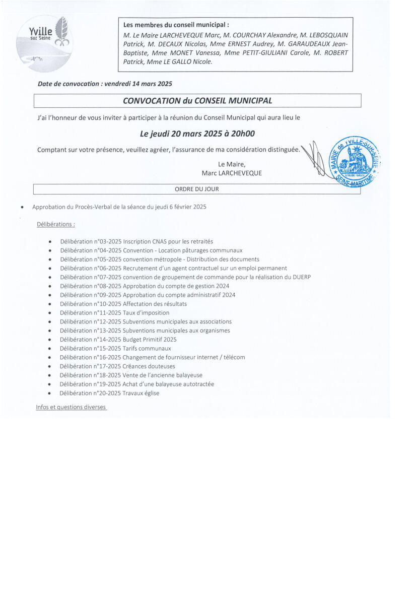 Conseil municipal / jeudi 20 mars 2025 3/14/25 Conseil Municipal Jeudi 20 mars 2025 20h - Mairie D'Yville-sur-Seine