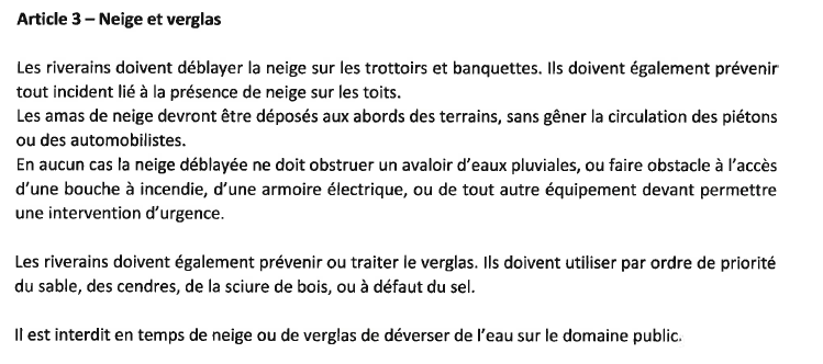 ➡️ Les riverains doivent également prévenir tout incident lié à la présence de neige ou de glace sur les toits (chutes, glissements, etc.).