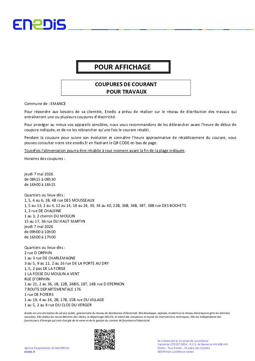 Coupure d'électricité programmée le 07/05/2026