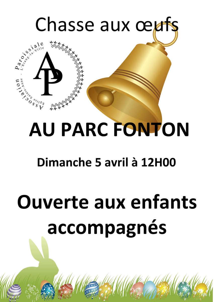 L'association paroissiale vous attend nombreux dimanche 5 avril à 12h sur le Parc Fonton, à l'occasion de la traditionnelle chasse aux œufs, ouverte aux enfants accompagnés.