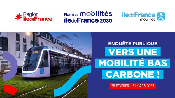 La Région Île-de-France et Île-de-France Mobilités, maîtres d’ouvrage du Plan des Mobilités, vous convient à participer à l’enquête publique relative au Plan des Mobilités en Île-de-France 2030 (PDMIF) qui se déroule jusqu’au 31 mars 2025 inclus.