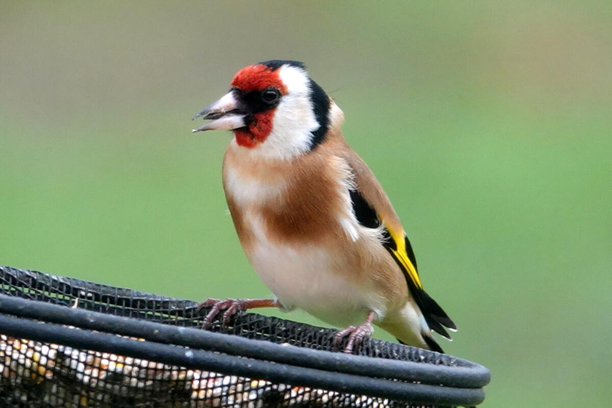 Le chardonneret élégant adulte est facilement reconnaissable à son masque facial rouge et noir, qui lui donne des allures de clown ainsi qu’aux marques alaires jaunes vif. Cet oiseau de 14 cm pour un poids de 13 à 19 g possède un bec relativement long et fin : celui d’un granivore.