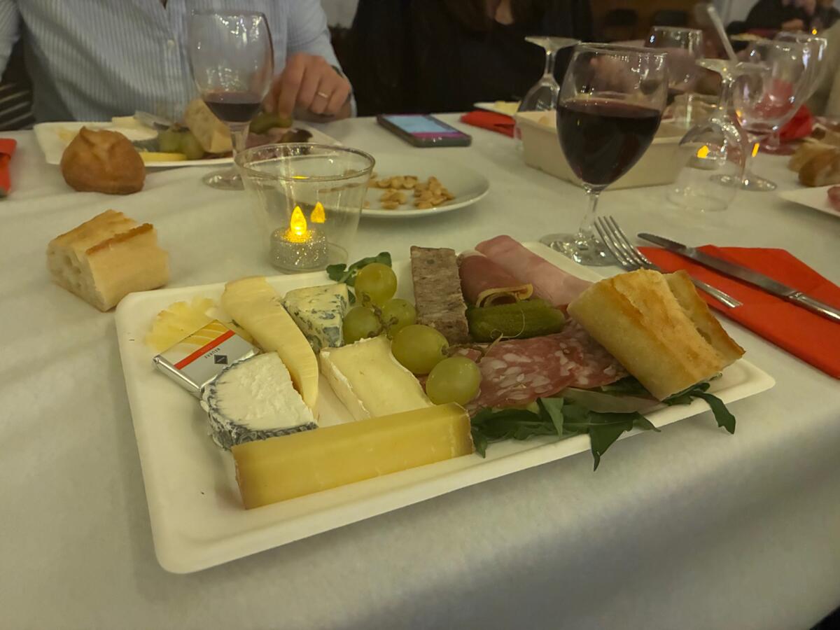 Les planches de charcuterie et de fromage accompagnaient gĂ©nĂ©reusement la dĂ©gustation du Beaujolais nouveau, parfait pour rĂ©chauffer lâatmosphĂšre alors que la neige tombait dehors.