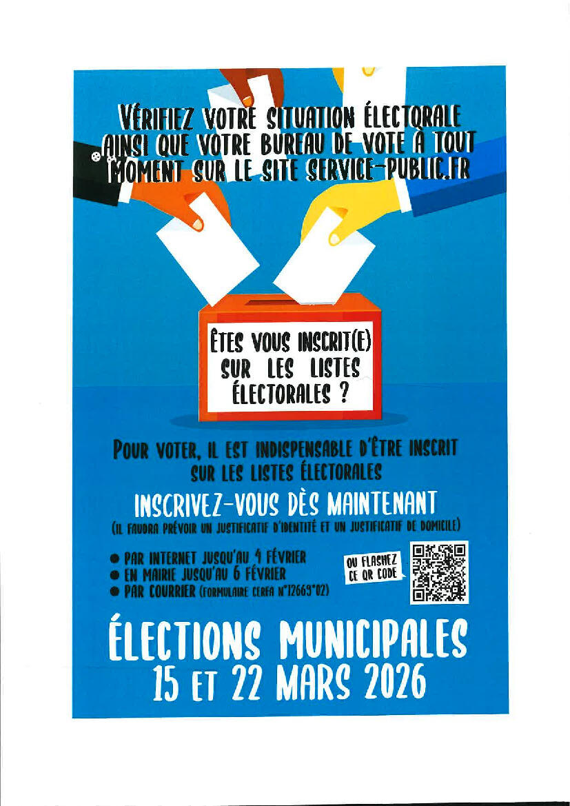 – L’inscription est possible jusqu’à 6 semaines du scrutin. Pour les élections municipales 2026, il sera possible de s’inscrire sur les listes électorales en ligne jusqu’au 4 février 2026 et en mairie jusqu’au 6 février 2026.