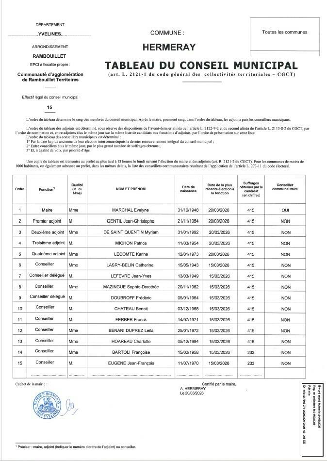 Tableau du Conseil Municipal suite aux votes du 20 Mars 2026: