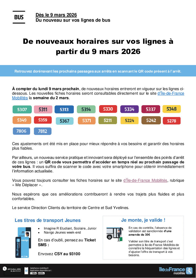 Ile de France mobilités nous informe qu'à compter de ce lundi 9 mars, de nouveaux horaires entreront en vigueur sur plusieurs lignes de bus du Centre et Sud Yvelines . Les nouvelles fiches horaires sont consultables directement sur le site d’Île-de-France Mobilités, rubrique "me déplacer". Ces modifications ont été mises en place afin d'améliorer la qualité de service apportée aux voyageurs.