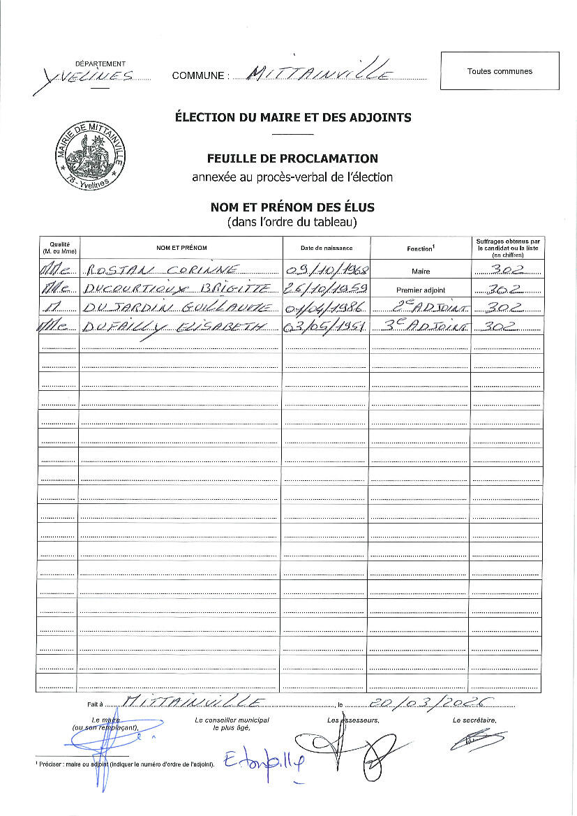 FEUILLE DE PROCLAMATION ELECTION MAIRE ET ADJOINTS