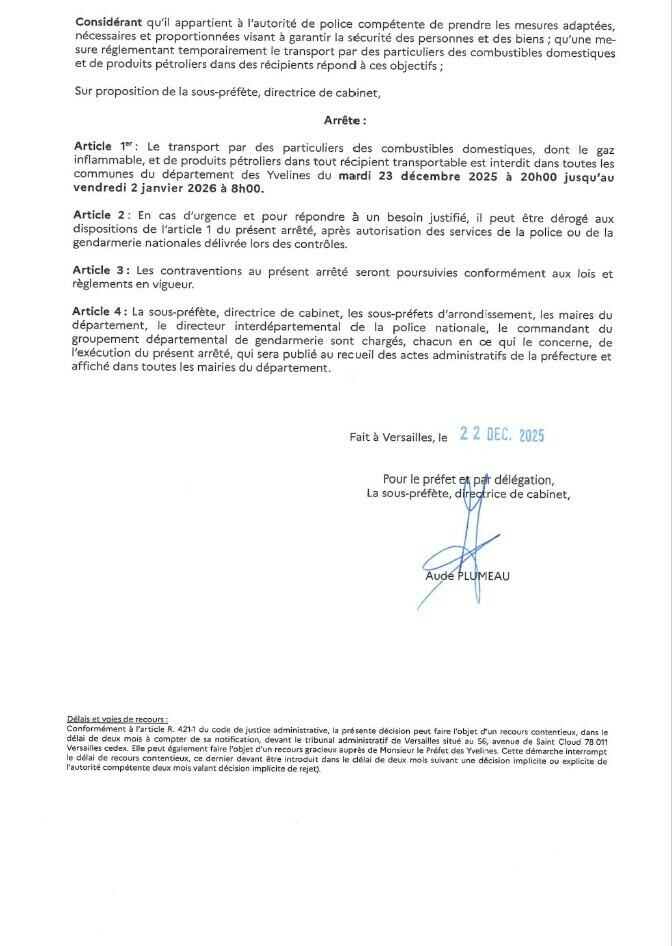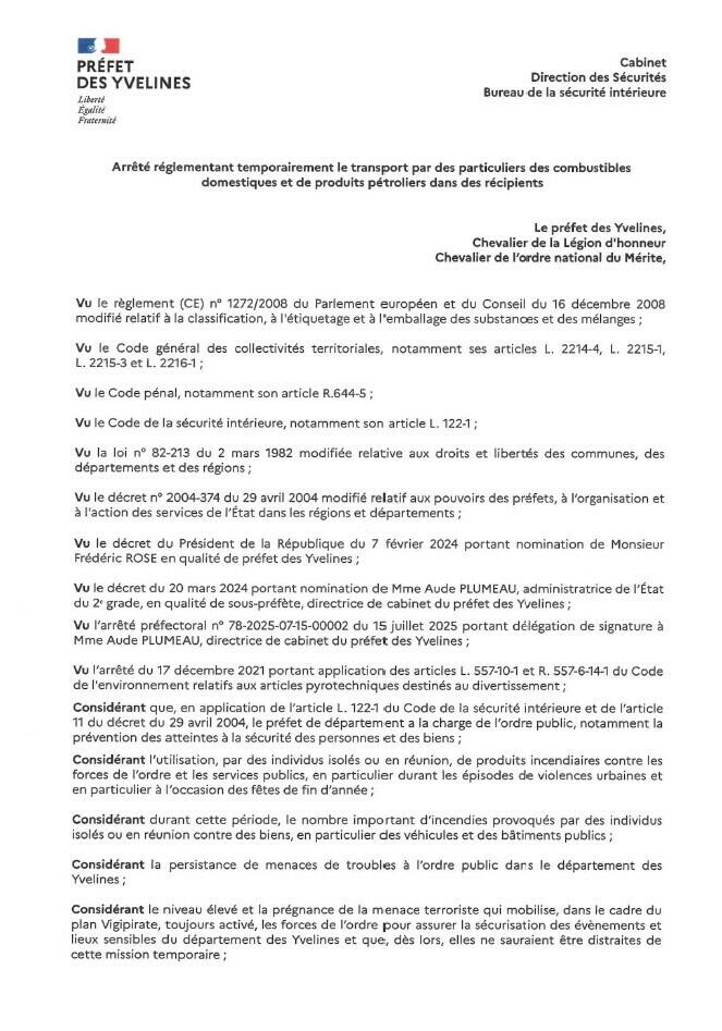 Dans la perspective des fêtes de fin d'année, la préfecture des Yvelines nous a communiqué deux arrêtés relatifs au carburant et aux artifices.