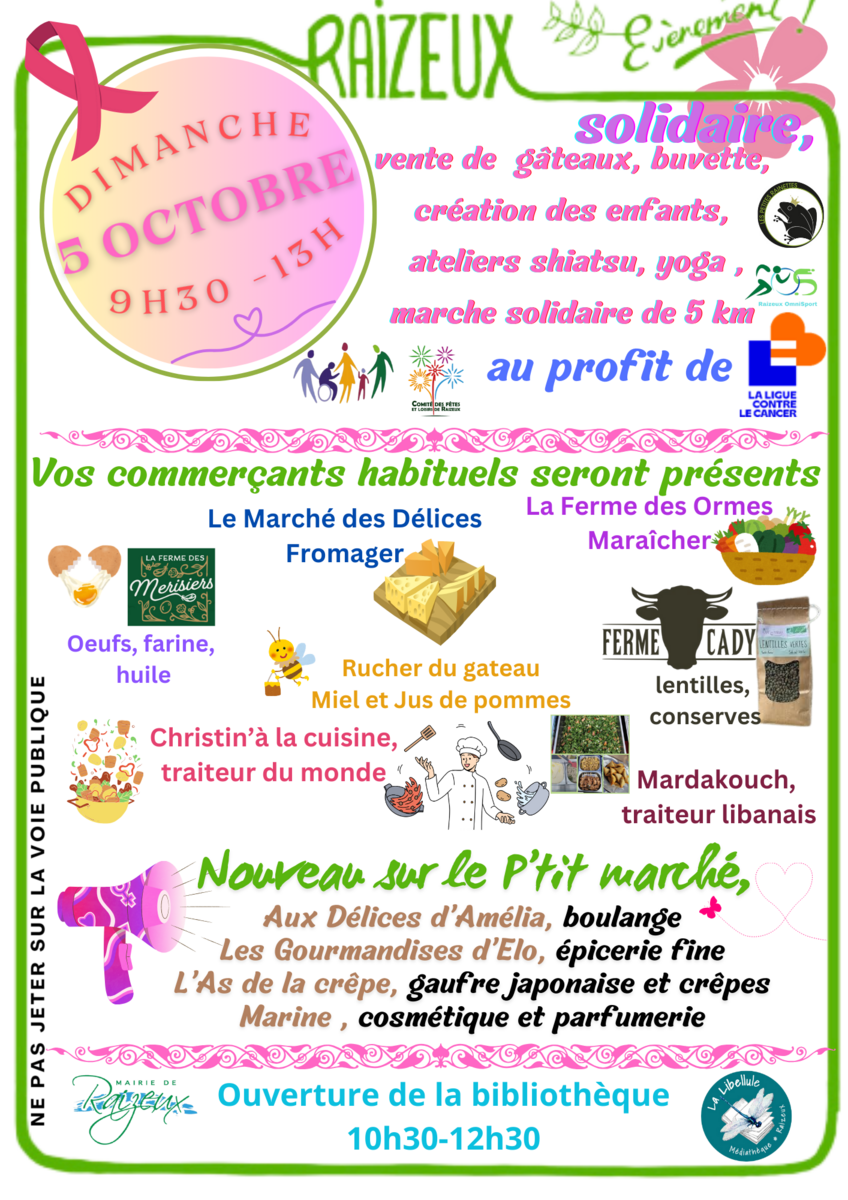 Ce dimanche, votre P'tit Marché de Raizeux prend des couleurs solidaires au profit de la Ligue contre le cancer 🌸.