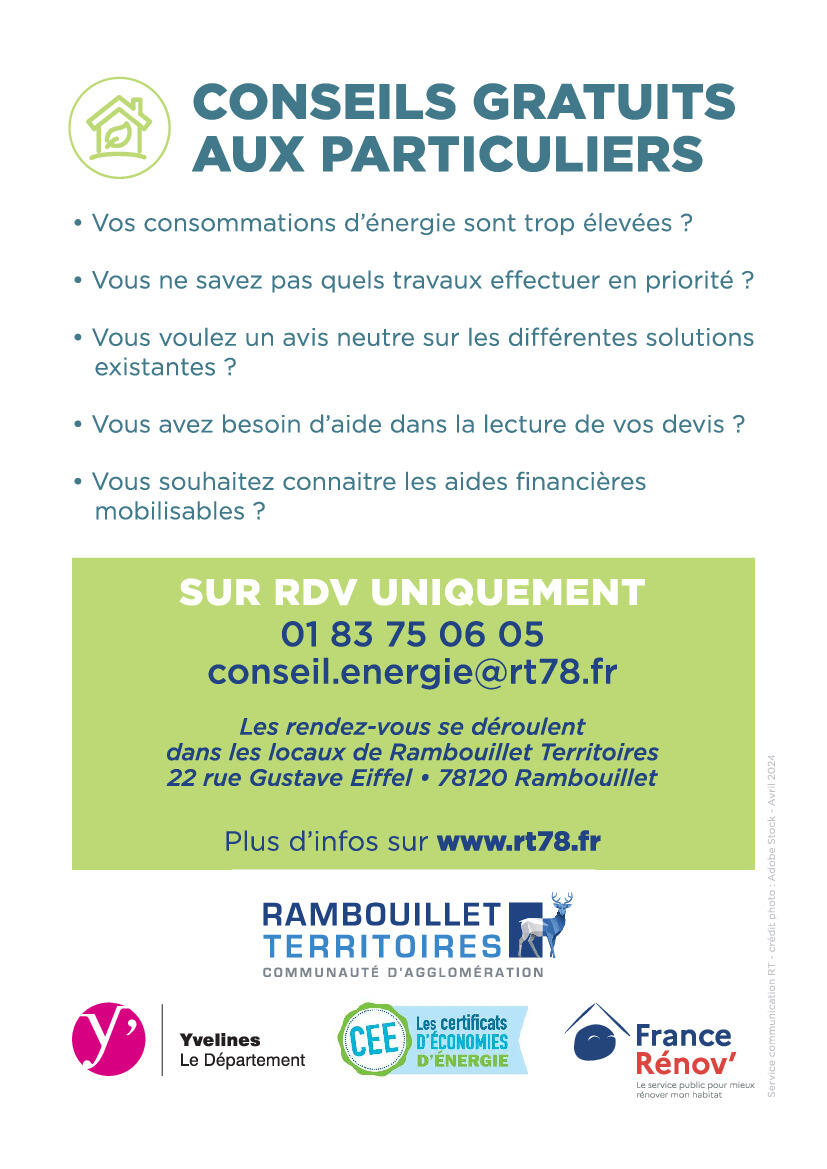Pour prendre Rendez-vous conseil.energie@rt78.fr ou au 01 83 75 06 05.