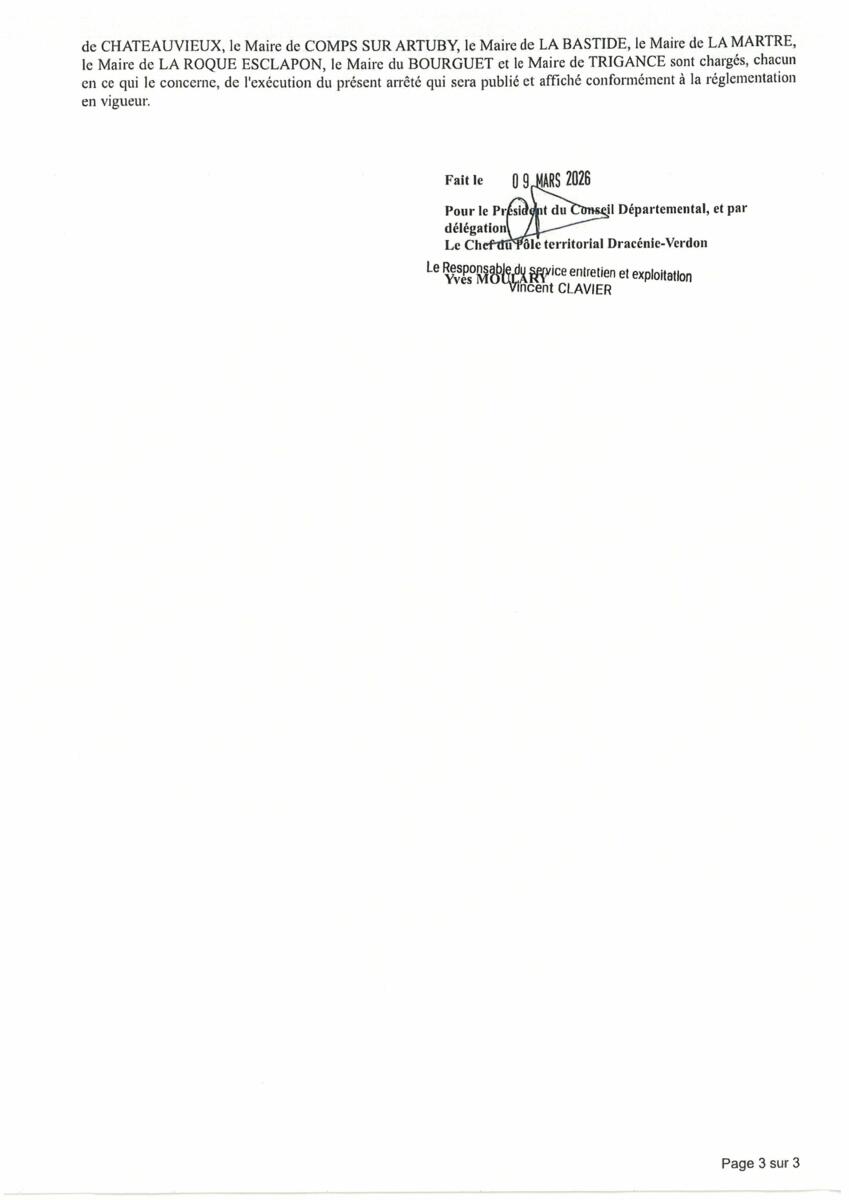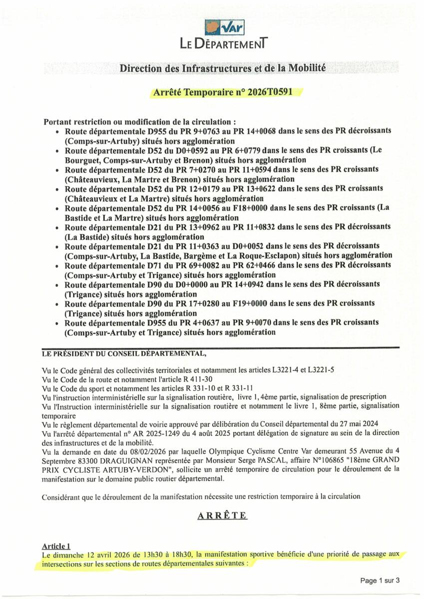 Bonjour à toutes et à tous, un arrêté temporaire de restriction de circulation N° 2026T0591 a été pris en raison du 18EME GRAND PRIX CYCLISTE ARTUBY VERDON QUI SE DÉROULERA LE DIMANCHE 12 AVRIL 2026 DE 13H30 A 18H30.