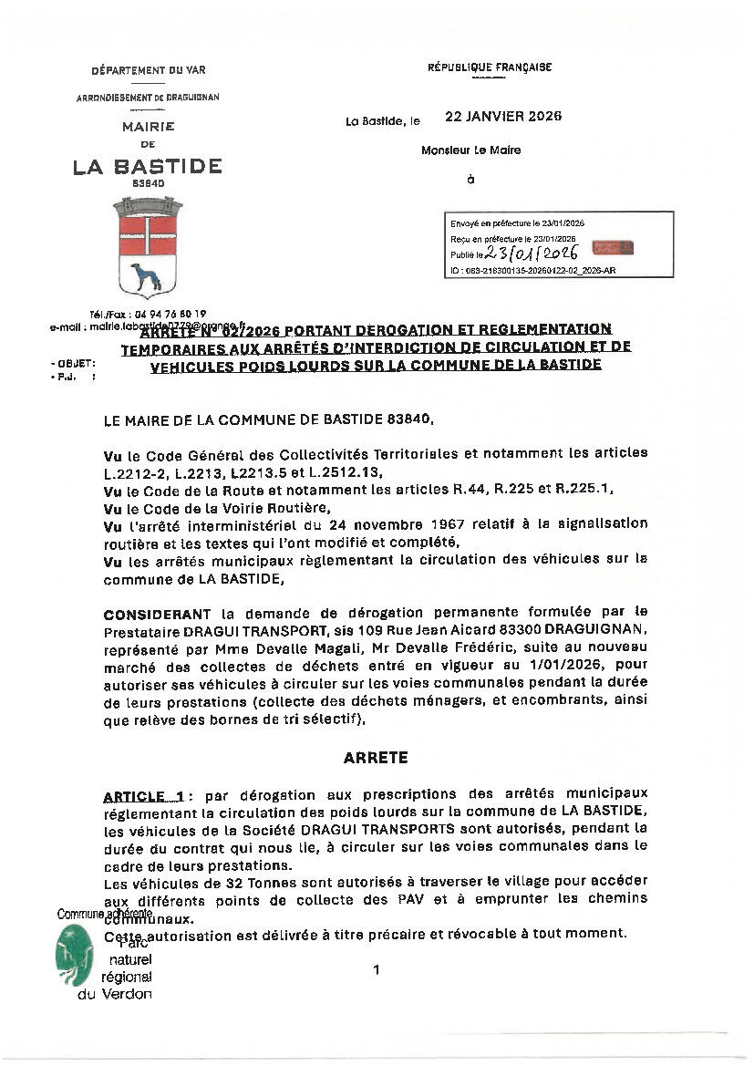 -  un arrêté n°02/2026 portant dérogation et règlementation temporaires aux arrêtés d'interdiction de circulation et de véhicules poids lourds sur la Commune de LA BASTIDE..
