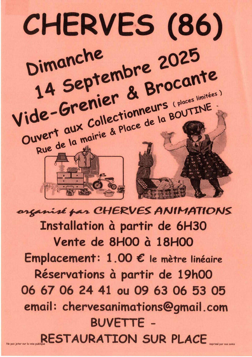 Vide Grenier Dimanche 14 septembre 7/15/25 Vide grenier & Brocante Rue de la Mairie & Place de la Boutine à Cherves