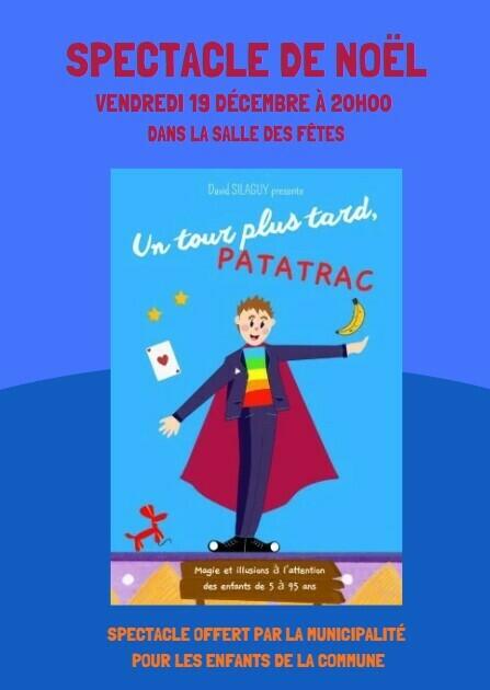 Nous vous rappelons que le spectacle de Noël pour les enfants de la commune aura lieu ce vendredi 19 décembre dans la salle des fêtes à partir de 20H00.