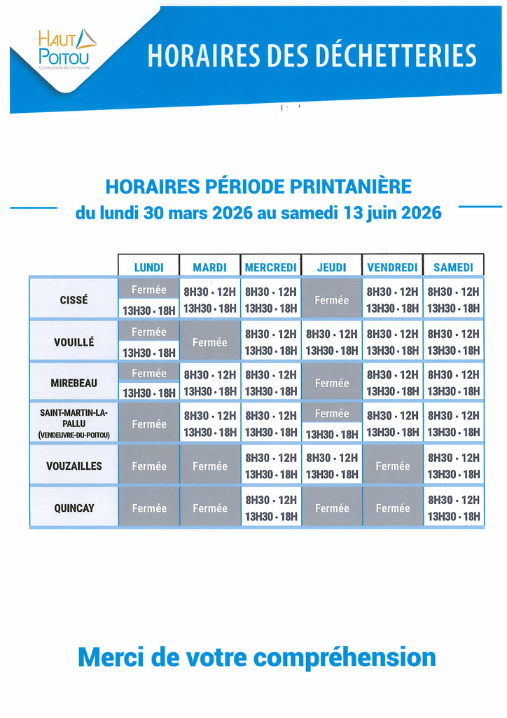 horaires déchetteries du 30 mars 2026 au 13 juin 2026