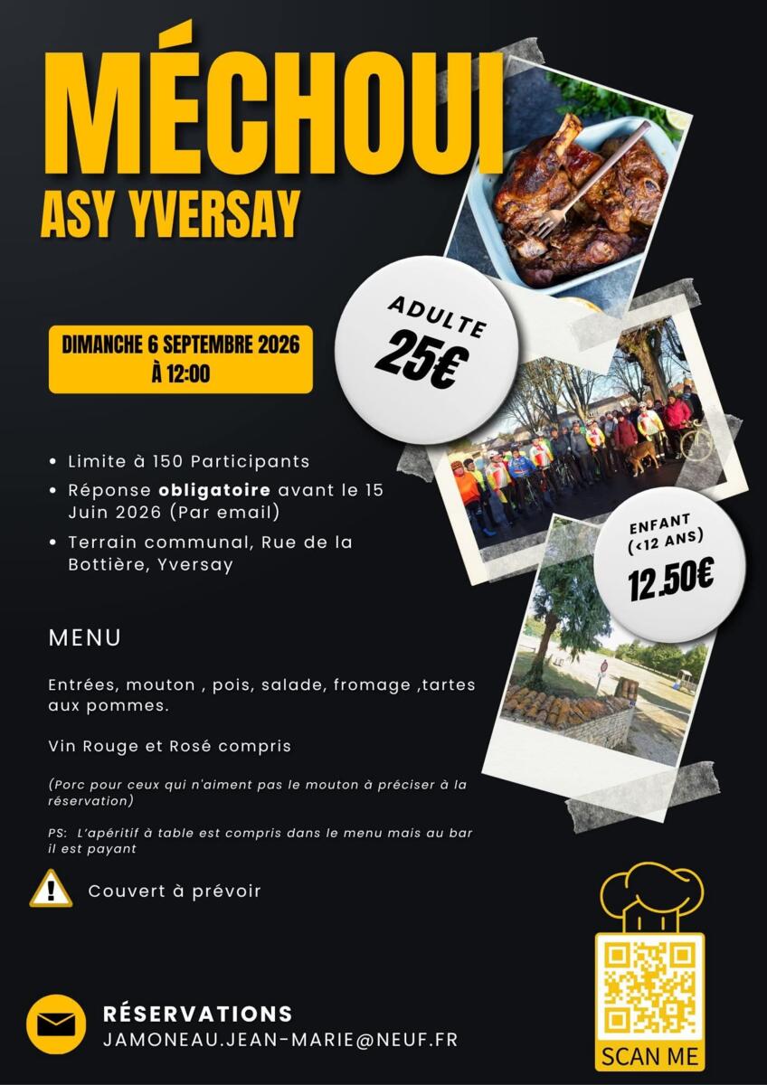 L'association ASY organise le dimanche 6 septembre leur traditionnel méchoui au terrain communal d'Yversay.