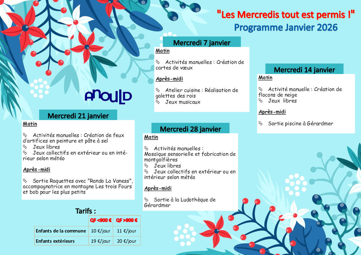 Ainsi, ce mercredi 14 janvier, nous nous rendrons à la piscine de Gérardmer. Le mercredi 21 janvier, nous proposons de nouveau la sortie raquettes accompagnée aux Trois Fours (sous réserve d'un nombre suffisant d'inscrits).