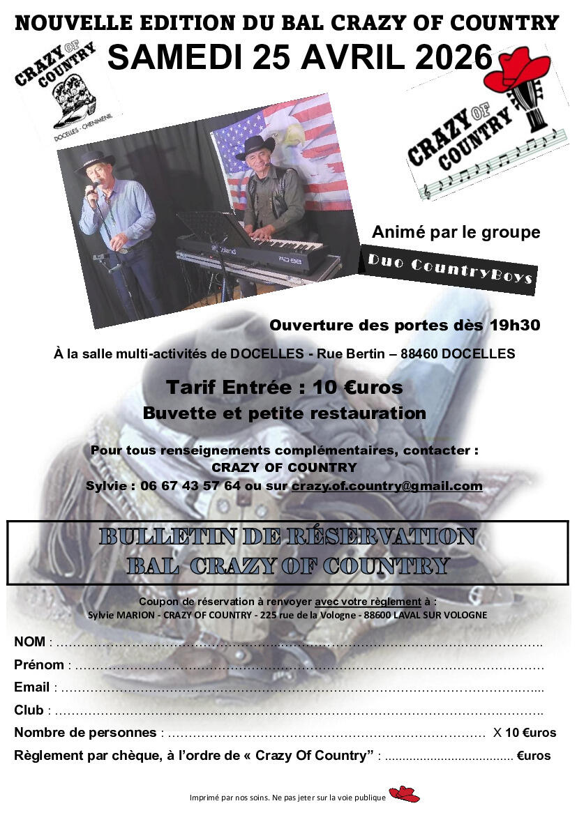 Le club CRAZY OF COUNTRY DOCELLES CHENIMENIL vous invite à sa soirée Country pleine de danse et de bonne humeur ! 🎶👢