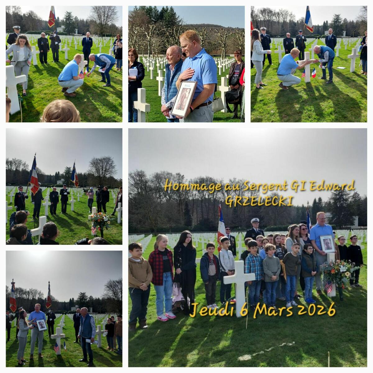 Puis un hommage solennel a été rendu au Cimetière Américain d’Epinal en présence des porte-drapeaux des AFN de Docelles, sur la tombe d’Edward GRZELECKI, GI mort au combat à Raon l’Etape à 22 ans, grand oncle de la famille MAJER.