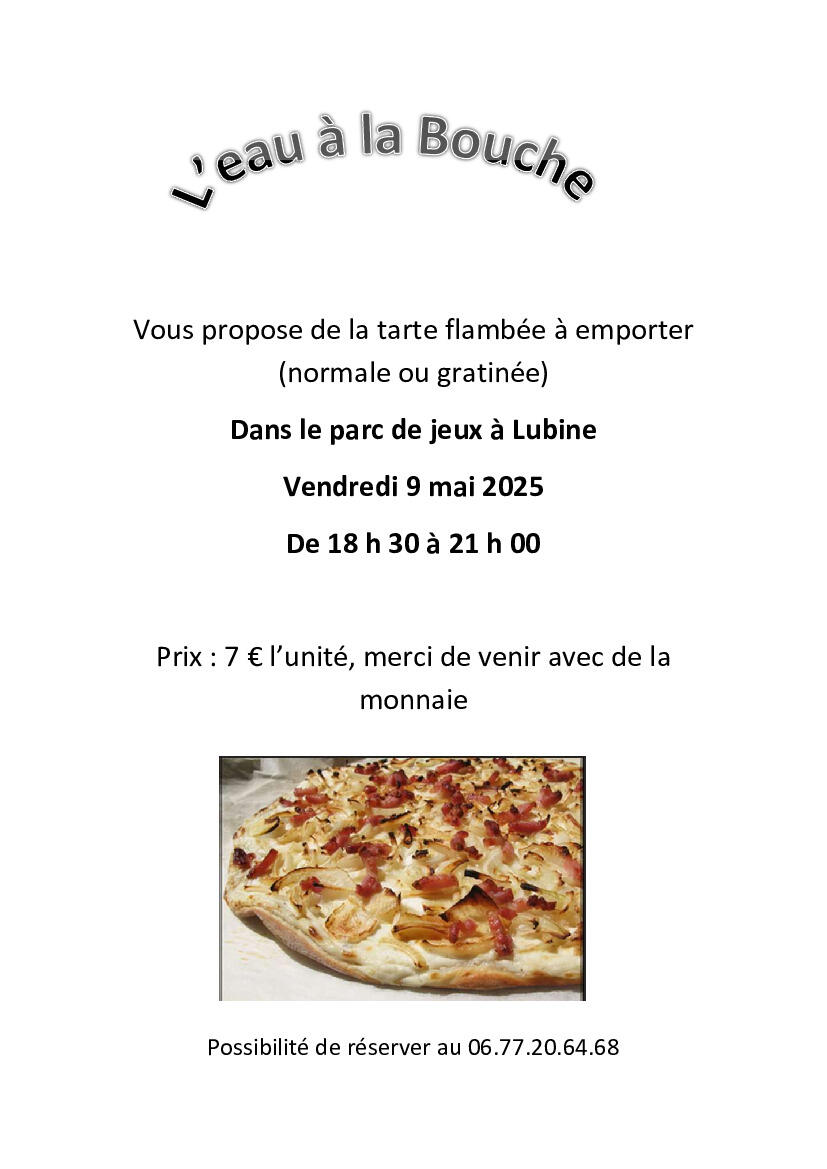 Tarte flambée à emporter vendredi 9 mai de 18h30 à 21h au parc de jeux à Lubine.