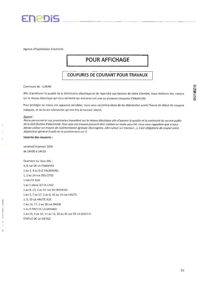 Nous vous informons que dans le cadre des travaux de sécurisation du réseau ENEDIS ( élagage des lignes HT ) un groupe électrogène sera mis en place sur la place du village le temps des travaux avec des coupures électriques de courte durée possibles le vendredi 09 janvier 2026.