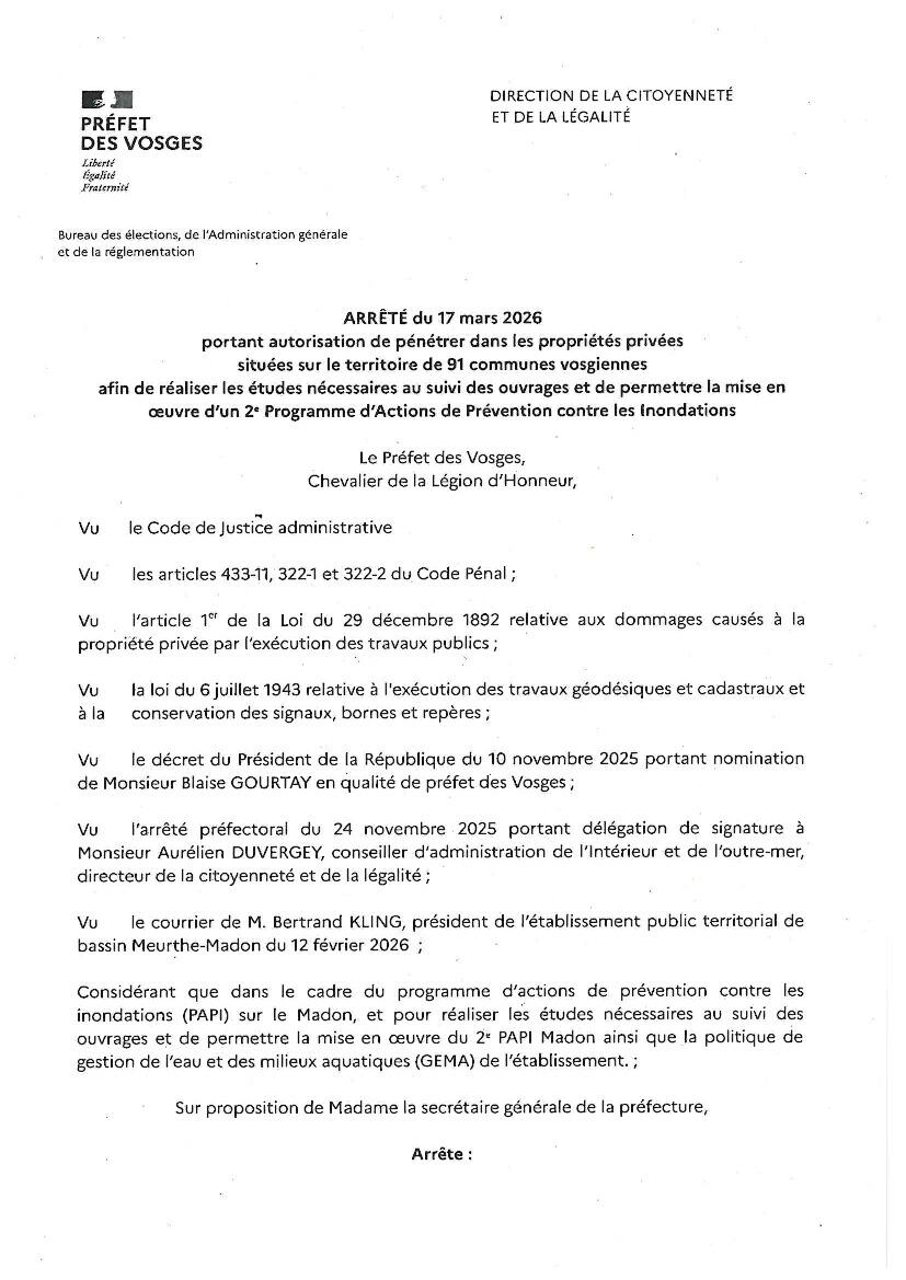 Vous trouverez en pièce jointe l'Arrêté Préfectoral (AP) portant autorisation de pénétrer dans les propriétés privées situées sur le territoire de 91 communes vosgiennes afin de réaliser les études nécessaires au suivi des ouvrages et de permettre la mise en œuvre d'un 2ème Programme d'Actions de Prévention contre les Inondations .