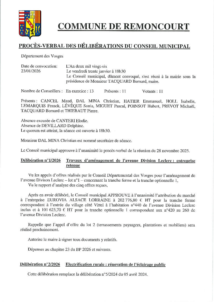 Vous trouverez en pièces jointes le compte rendu et le procès-verbal de la réunion du Conseil municipal du 30 janvier 2026.