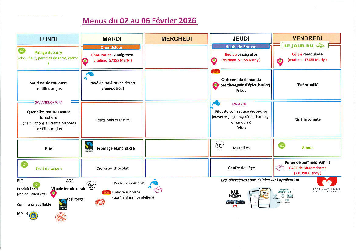 Vous trouverez en pièces jointes les menus de la cantine scolaire en février 2026.