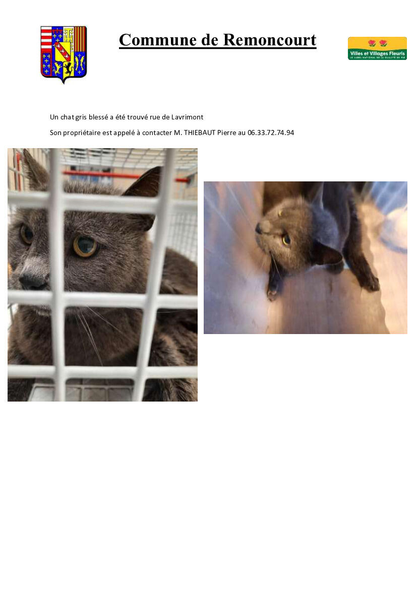 Un chat gris a été trouvé blessé rue de Lavrimont.