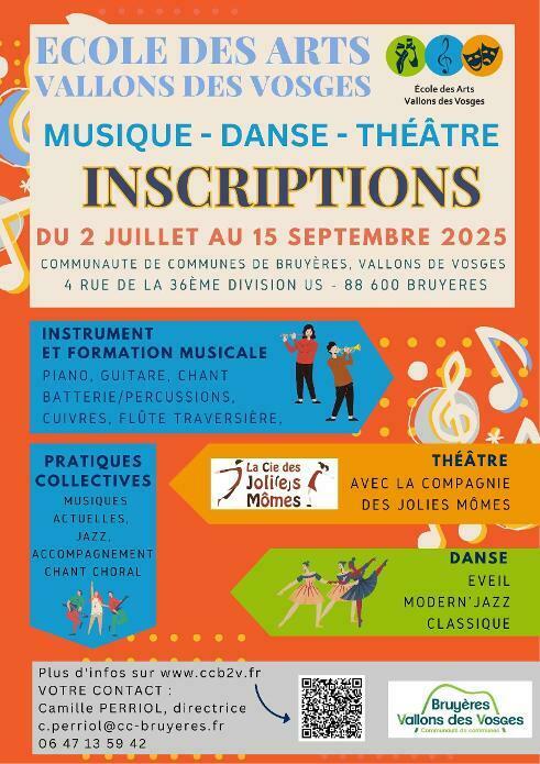 L'Ecole des Arts, Vallons des Vosges ouvre ses inscriptions à partir du mercredi 2 juillet et jusqu’au 15 septembre pour les nouveaux élèves. Elle propose de la musique et de la danse et s'associe avec la Compagnie des Jolies Mômes pour le théâtre.