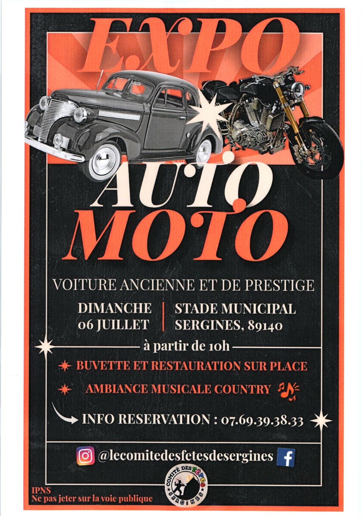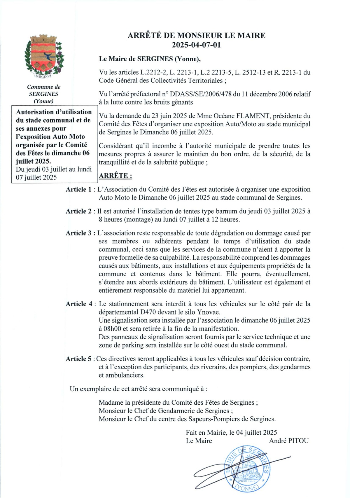 Arrêté du Maire pour le Dimanche 06 juillet 2025 au Stade communal de Sergines à l'occasion de l'exposition AUTO MOTO organisée par le Comité des Fêtes.
