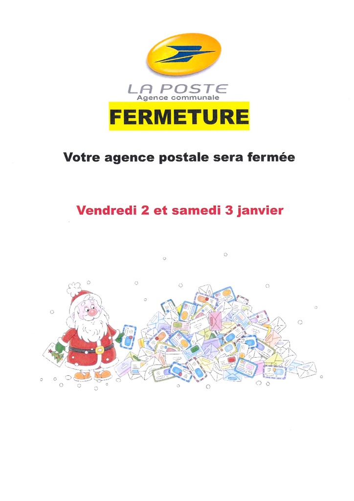L'agence postale communale sera fermée du vendredi 02 janvier au samedi 03 janvier 2026 inclus.