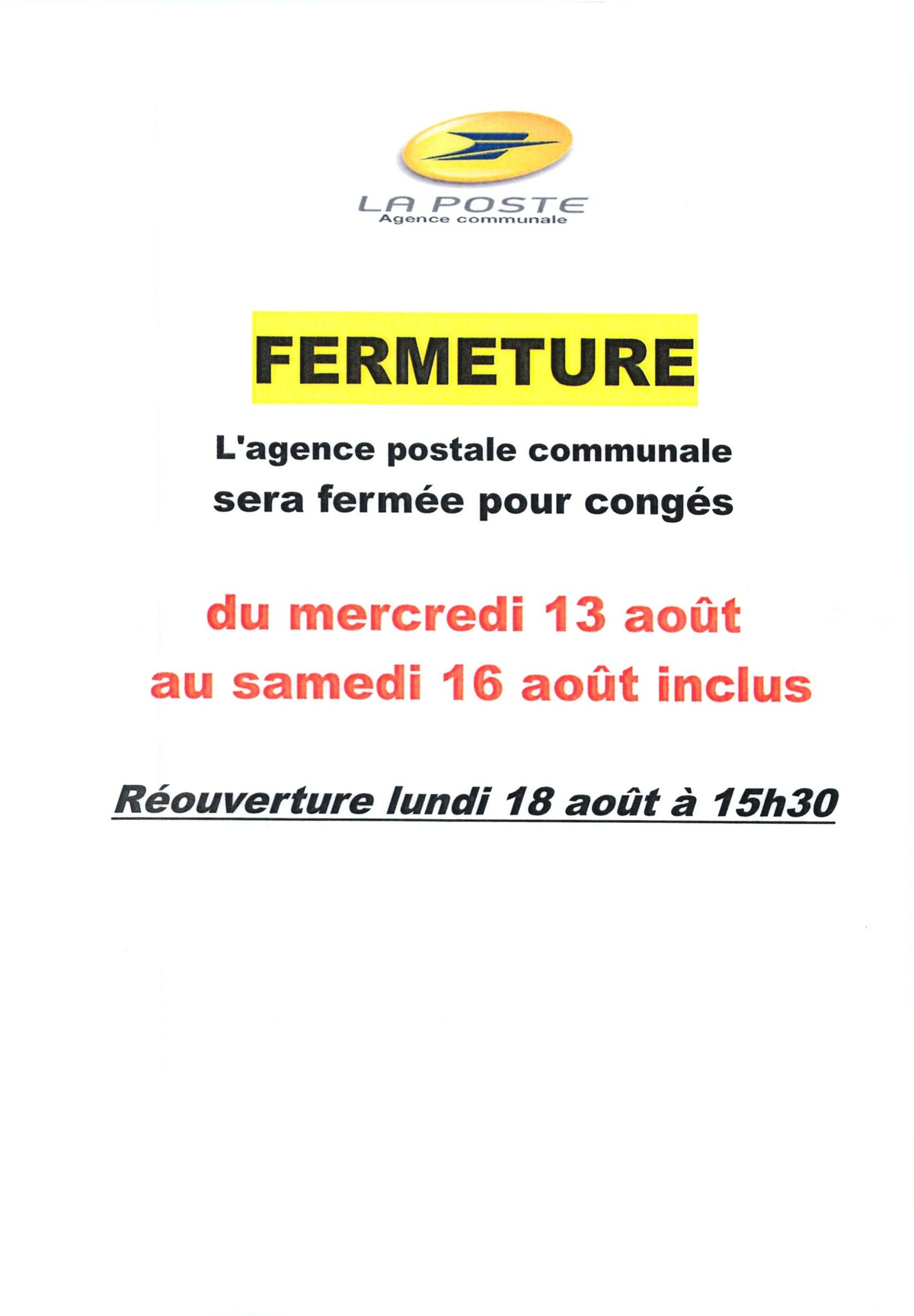 FERMETURE DE L'AGENCE POSTALE POUR CONGÉS