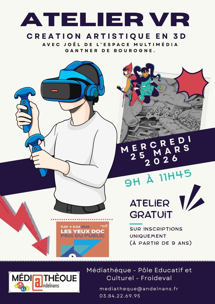 Dans le cadre du Prix du Public-Les Yeux Doc, la médiathèque d'Andelnans vous propose un atelier réalité virtuelle VR le mercredi 25 mars 2026 de 9h00 à 11h45 au Pôle Educatif et Culturel de Froideval.
