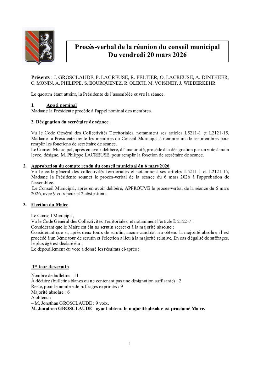Réunion de Conseil Municipal du 20 mars 2026