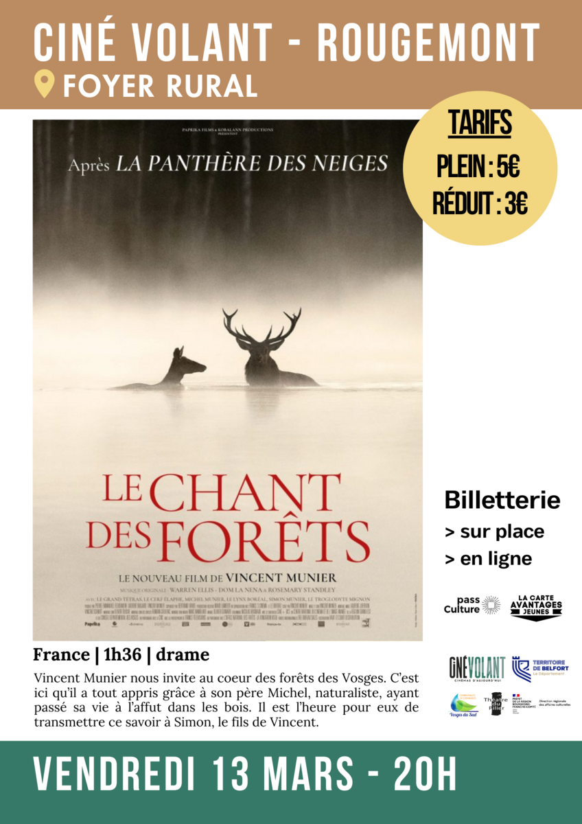 - Rougemont Le Château Foyer Rural 20 rue de Masevaux : Le chat des forêts - vendredi 13 mars- Giromagny Espace La Savoureuse 7 rue des Casernes : La femme la plus riche du monde - mercredi 18 mars