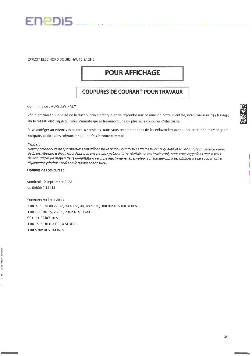 ENEDIS nous informe une coupure de courant pour travaux le vendredi 12 septembre de 8h30 à 11h15.