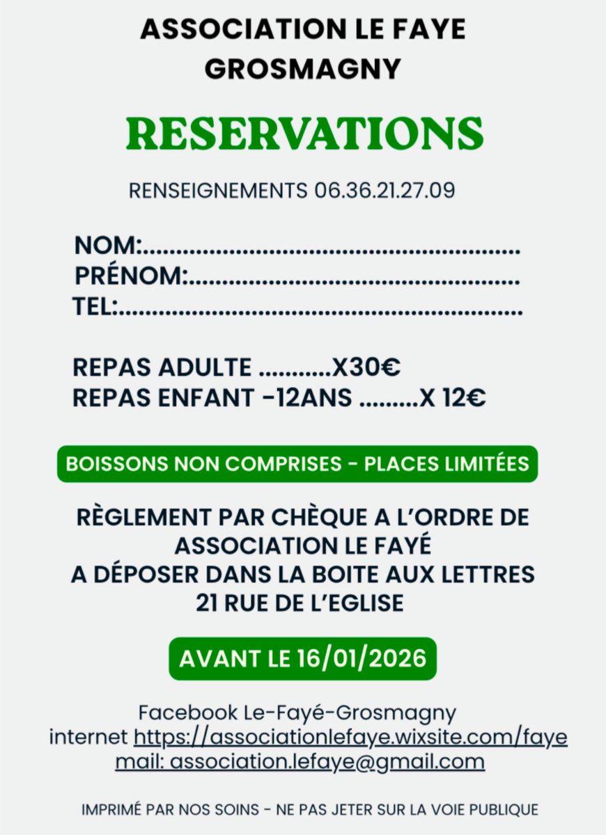 Soirée Couscous À Grosmagny Le 31/01/2026 11/01/2026 Soirée dansante le 31 janvier 2026 organisée par l'association Le Fayé Réservation avant le 16/01 et informations par mail association.lefaye@gmail.com ou par tel 06 36 21 27 09 à partir de 19h30.