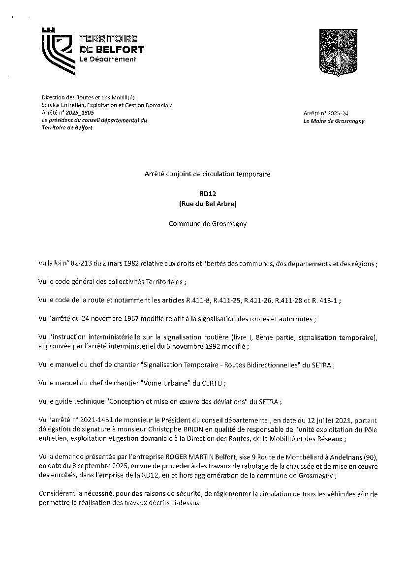 Je vous prie de bien vouloir trouver ci-joint un arrêté conjoint de circulation temporaire "Mairie de Grosmagny / Département du Territoire de Belfort" relatif à des travaux de rabotage et de mise en œuvre d'enrobé, ainsi que le plan de déviation mis en place.