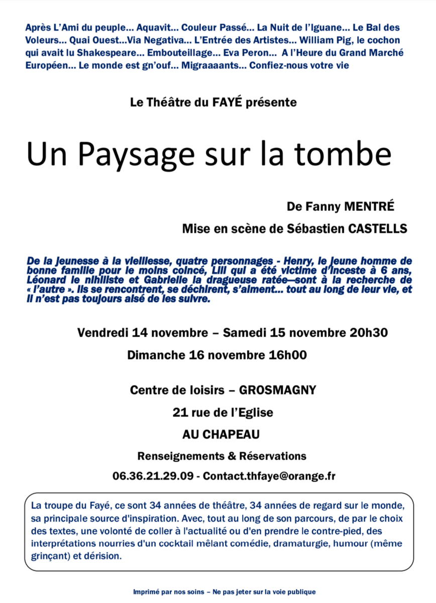 Théâtre du Fayé les 14-15 et 16 novembre 11/4/25 Venez découvrir le nouveau spectacle de la troupe du théâtre du FAYE Source : Mairie de Grosmagny