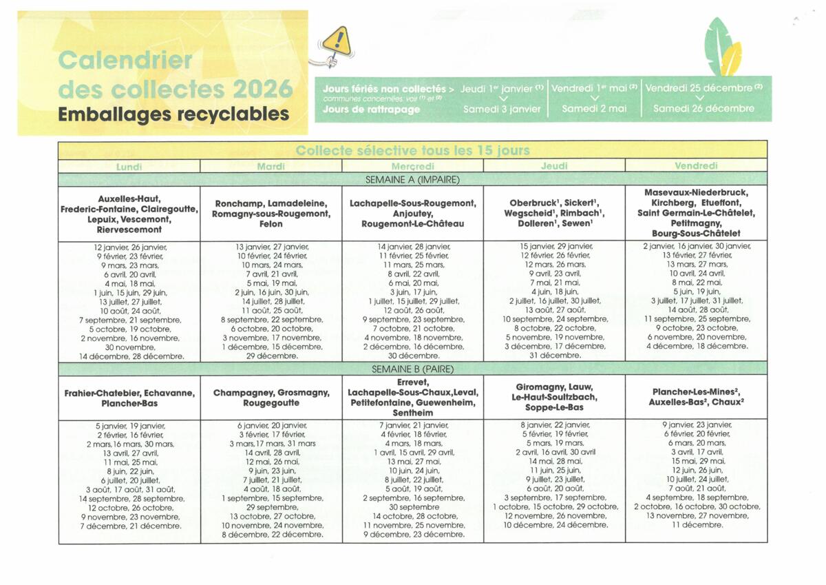 Prochaines collectes des sacs jaunes 3/10/26 Pensez à sortir vos sacs jaunes ce soir ! Source : Mairie de Rougemont-le-Château