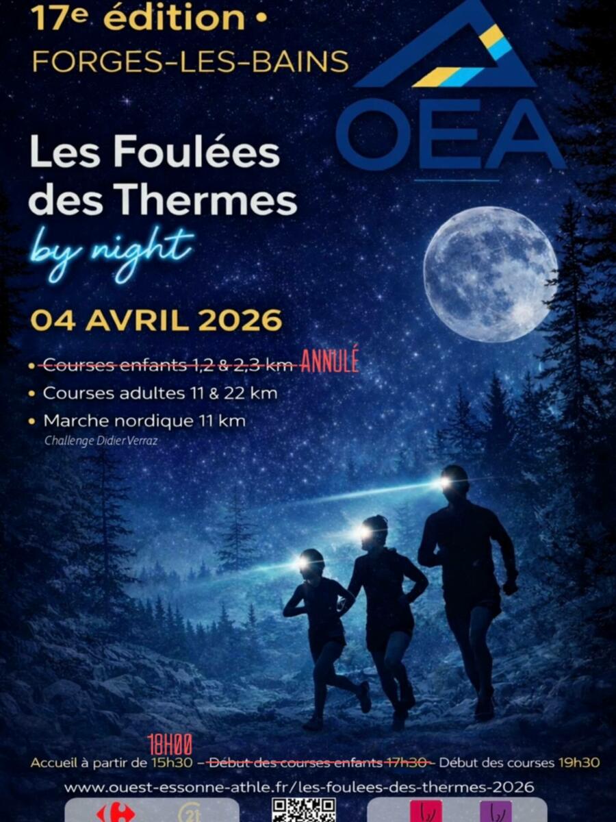 Inscriptions ouvertes jusqu'au 2 avril à minuit en ligne : https://www.ouest-essonne-athle.fr/les-foulees-des-thermes-2026