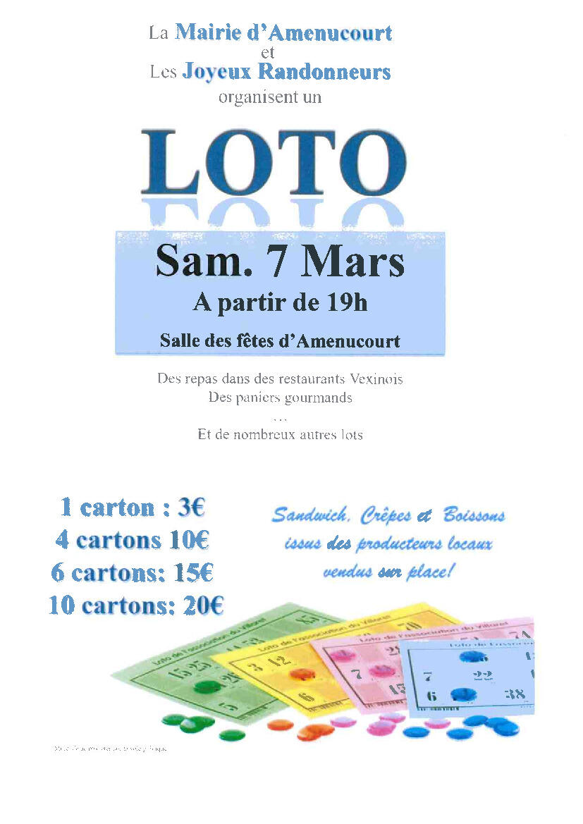 Le samedi 07 Mars loto annuel salle des fêtes d'Amenucourt animé par l'association "Les Joyeux Randonneurs". Restauration sur place, accueil à partir de 19h.