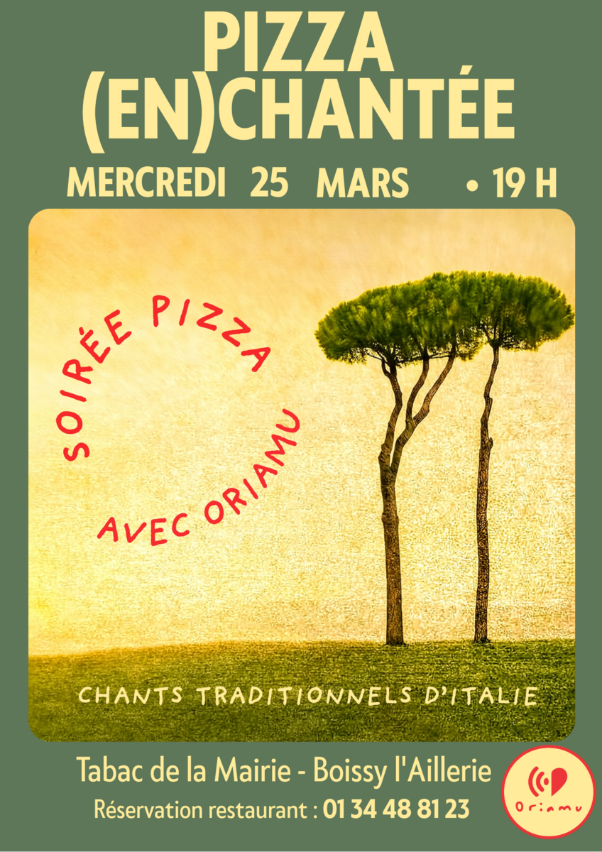 Venez nombreux le 25 mars à 19h au Tabac de la Mairie de Boissy l'Aillerie pour découvrir des chants traditionnels d'Italie autour d'une délicieuse pizza !