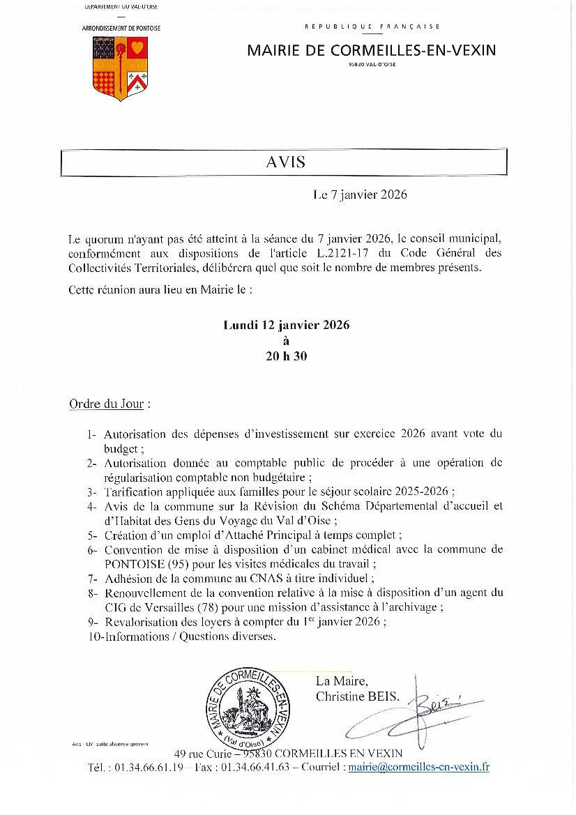 Prochain Conseil Municipal le Lundi 12 Janvier 2026 à 20H30