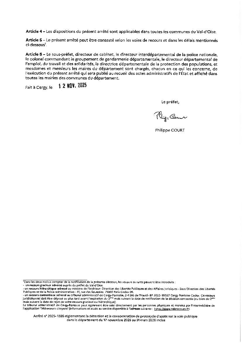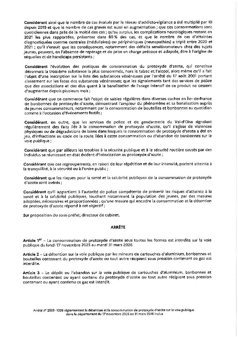 Vous trouverez ci-joint, l'arrêté réglementant la détention et la consommation de protoxyde d'azote sur la voie publique dans le Val d'Oise.