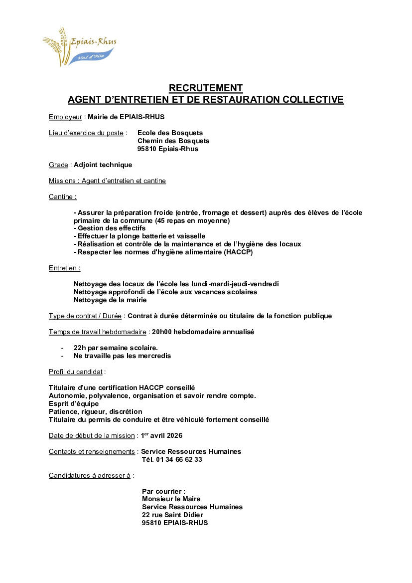 Vous trouverez ci-joint l'annonce concernant le recrutement d'un agent d'entretien et de restauration scolaire.