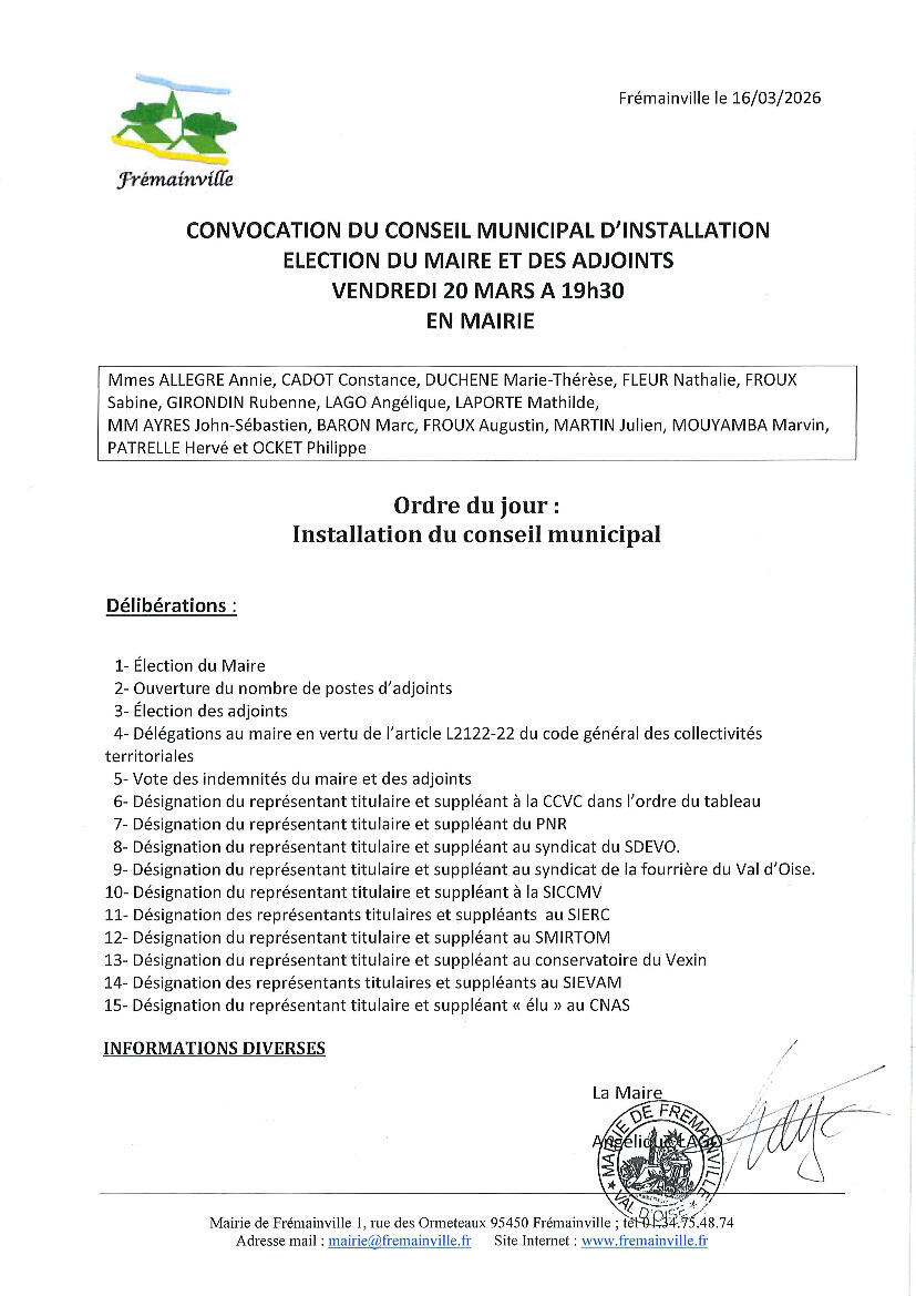 Conseil municipal 3/17/26 Le conseil d'installation se tiendra le 20 mars à 19h30 dans la salle du conseil de la mairie.