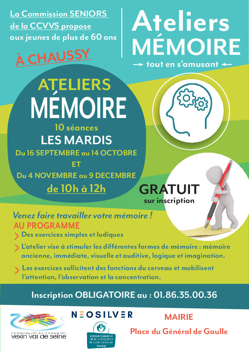 La commission Seniors de la CCVVS propose aux jeunes de plus de 60 ans 10 ateliers MÉMOIRE. Ces ateliers se dérouleront à la mairie de Chaussy tous les mardis à partir du 16 septembre jusqu’au 9 décembre de 10h à 12h.